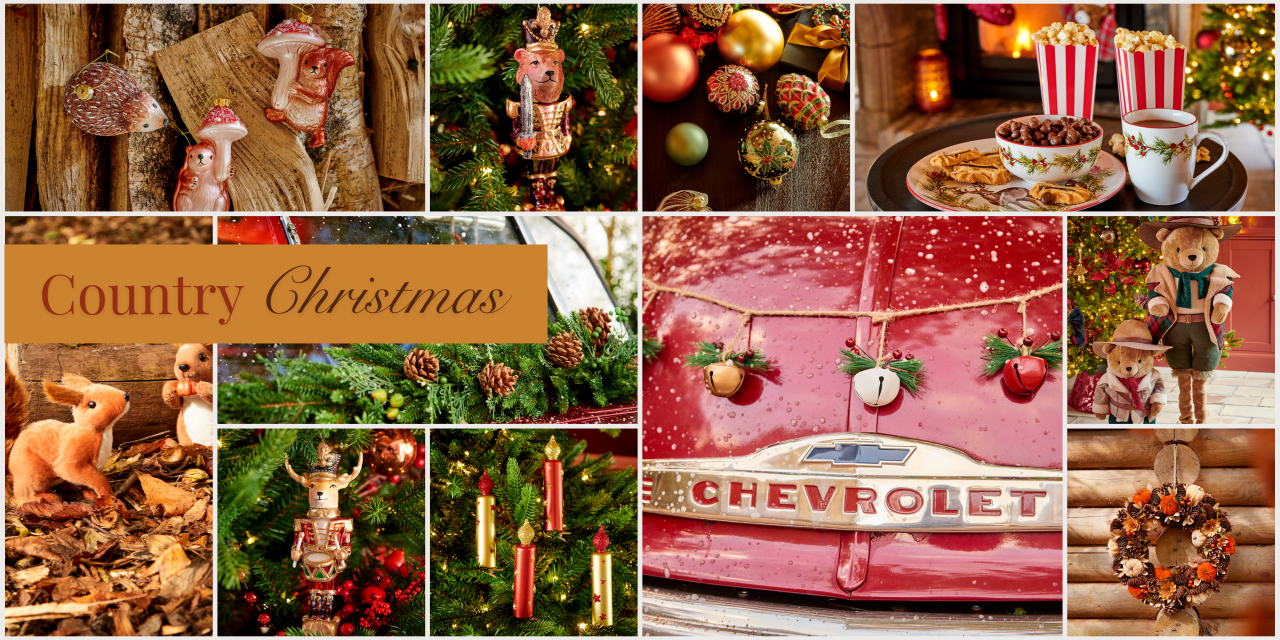 Met Country Christmas haal je de charme van een winterse blokhut midden in het bos naar je woonkamer. Deze stijl ademt rust, natuur en geborgenheid. Denk aan diepe groentinten van dennentakken, warme accenten in rood en oxblood, gecombineerd met hout, wol en vintage decoraties die doen denken aan vroeger.